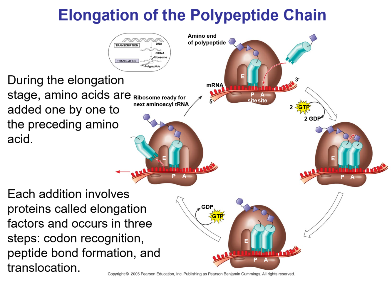 EACH ADDITION IS FACILITATED BY PROTEINS CALLED ELONGATION FACTORS.