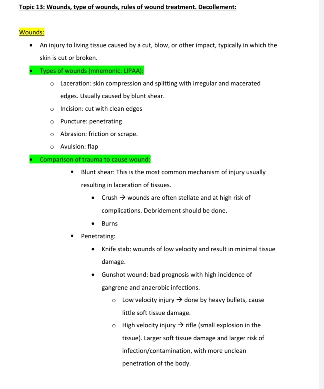 Wounds, types of wounds, rules of wounds treatment. Decollement.