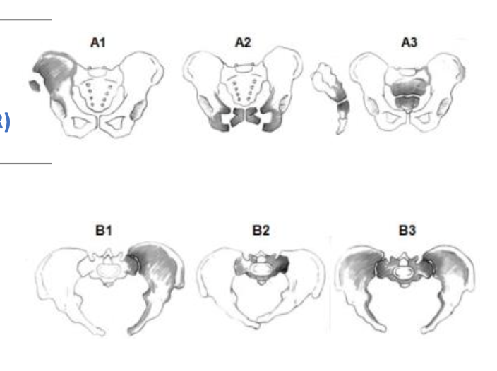 Desvio vertical e diastase da sinfise, ou fratura dos ramos anteriores e fratura da asa do iliaco ou do sacro, ou luxacao SI posterior