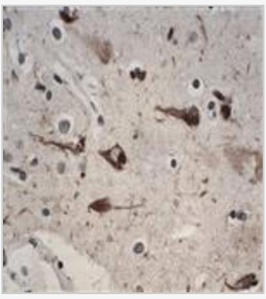 This brain micrograph of a 68 yo male nursing home resident who had a vague history of dementia and relatively rapid decline shows which of the following?