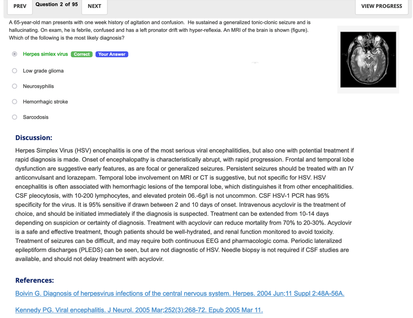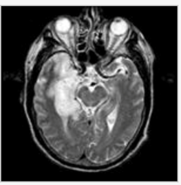 A 65-year-old man presents with one week history of agitation and confusion. He sustained a generalized tonic-clonic seizure and is hallucinating. On exam, he is febrile, confused and has a left pronator drift with hyper-reflexia. An MRI of the brain is shown (figure). Which of the following is the most likely diagnosis?