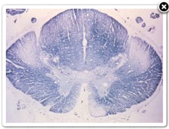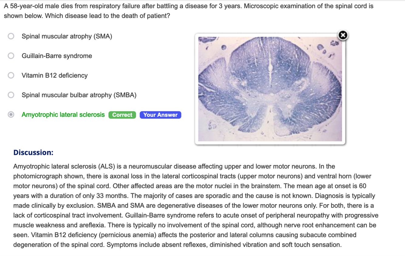 A 58-year-old male dies from respiratory failure after battling a disease for 3 years. Microscopic examination of the spinal cord is shown below. Which disease lead to the death of patient?