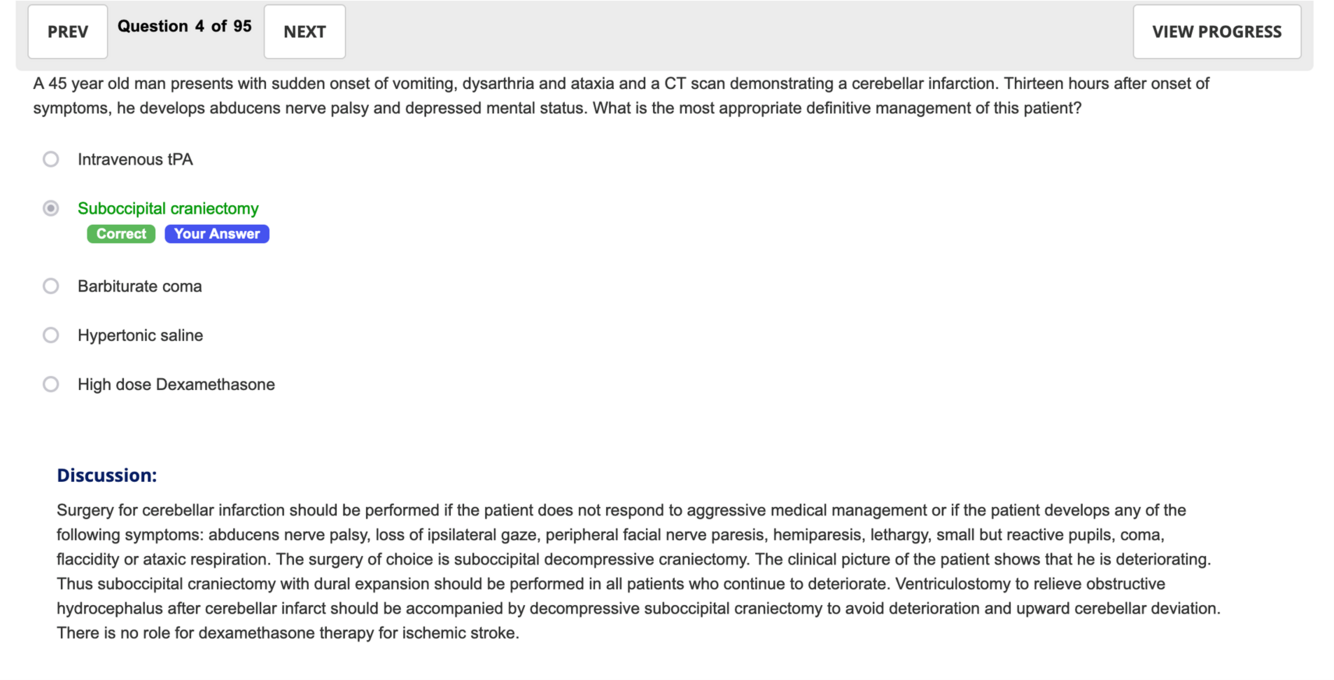 A 45 year old man presents with sudden onset of vomiting, dysarthria and ataxia and a CT scan demonstrating a cerebellar infarction. Thirteen hours after onset of symptoms, he develops abducens nerve palsy and depressed mental status. What is the most appropriate definitive management of this patient?