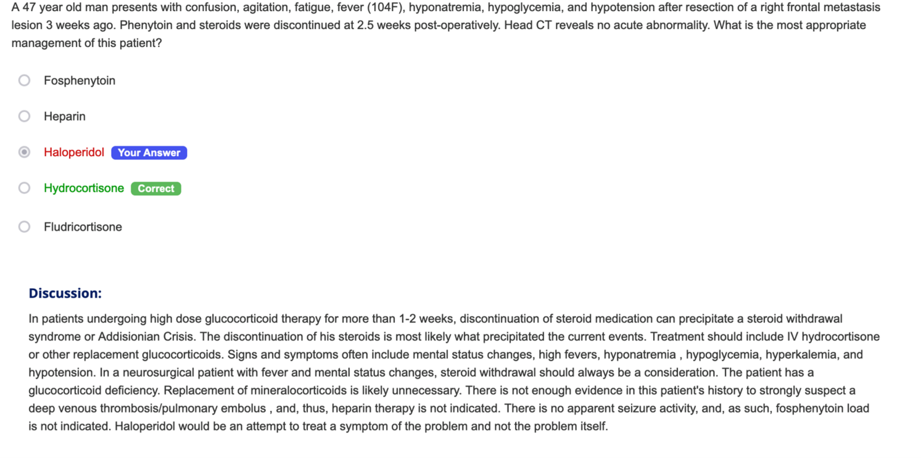 A 47 year old man presents with confusion, agitation, fatigue, fever (104F), hyponatremia, hypoglycemia, and hypotension after resection of a right frontal metastasis lesion 3 weeks ago. Phenytoin and steroids were discontinued at 2.5 weeks post-operatively. Head CT reveals no acute abnormality. What is the most appropriate management of this patient?