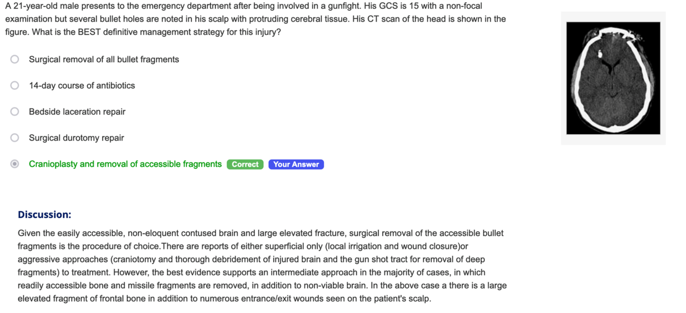 A 21-year-old male presents to the emergency department after being involved in a gunfight. His GCS is 15 with a non-focal examination but several bullet holes are noted in his scalp with protruding cerebral tissue. His CT scan of the head is shown in the figure. What is the BEST definitive management strategy for this injury?