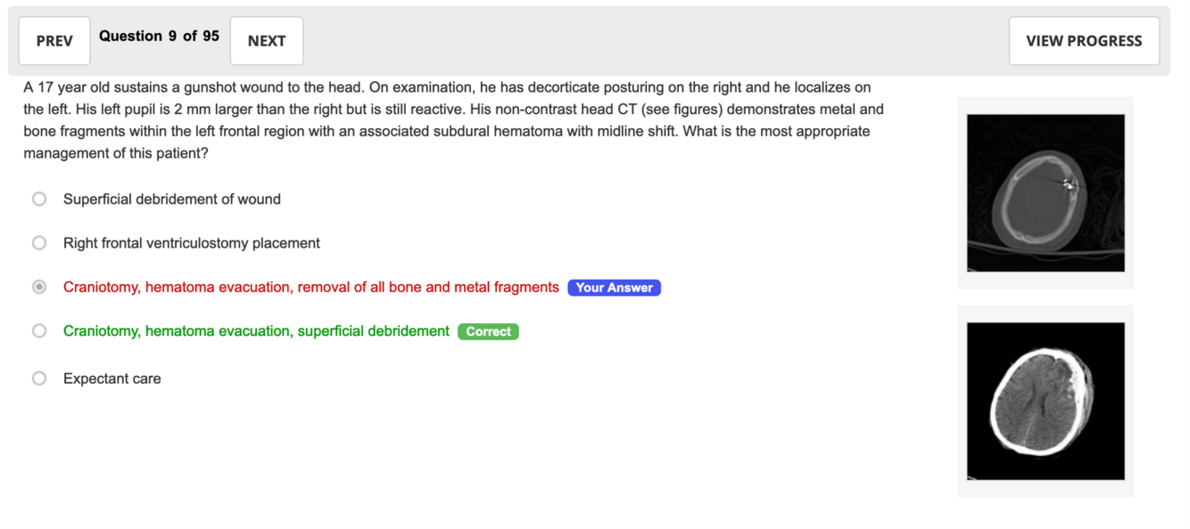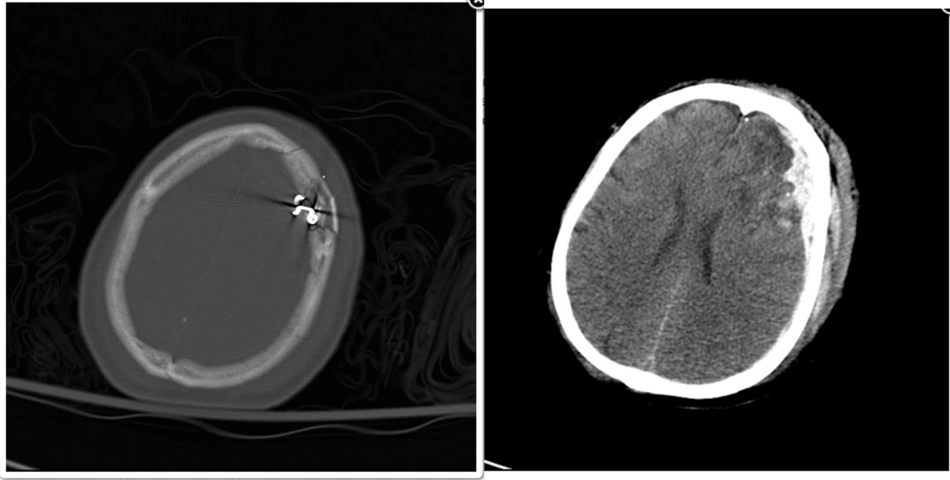 A 17 year old sustains a gunshot wound to the head. On examination, he has decorticate posturing on the right and he localizes on the left. His left pupil is 2 mm larger than the right but is still reactive. His non-contrast head CT (see figures) demonstrates metal and bone fragments within the left frontal region with an associated subdural hematoma with midline shift. What is the most appropriate management of this patient?
