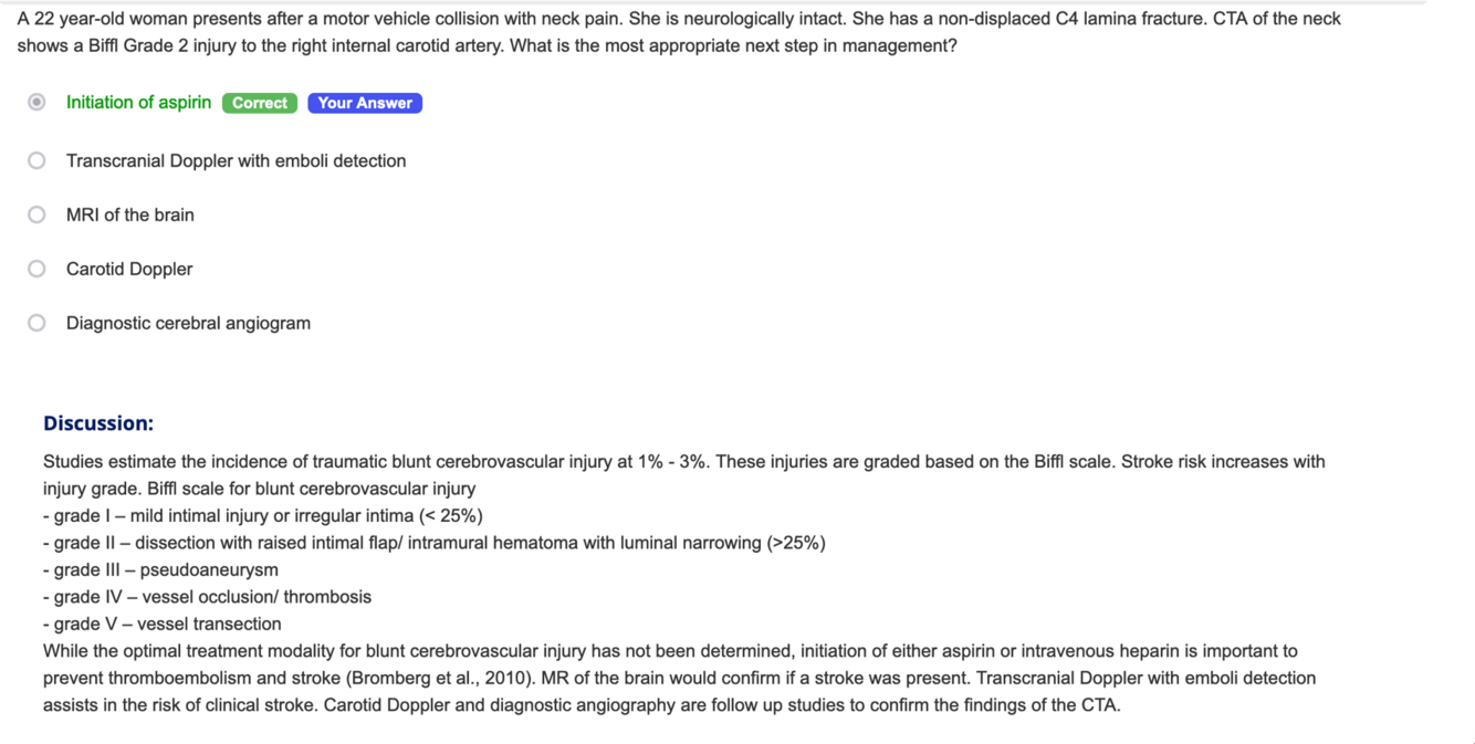 A 22 year-old woman presents after a motor vehicle collision with neck pain. She is neurologically intact. She has a non-displaced C4 lamina fracture. CTA of the neck shows a Biffi Grade 2 injury to the right internal carotid artery. What is the most appropriate next step in management?