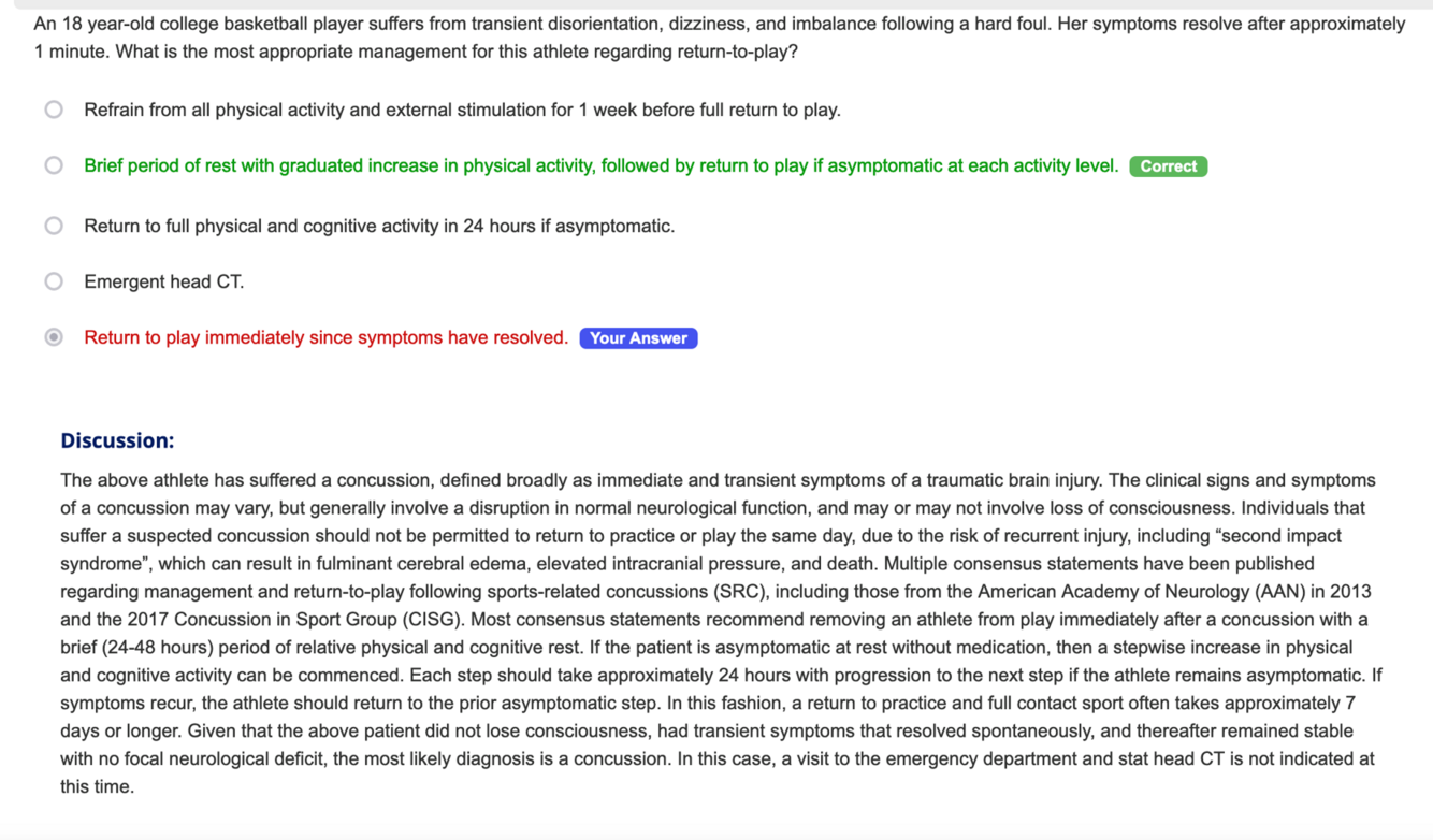 An 18 year-old college basketball player suffers from transient disorientation, dizziness, and imbalance following a hard foul. Her symptoms resolve after approximately 1 minute. What is the most appropriate management for this athlete regarding return-to-play?