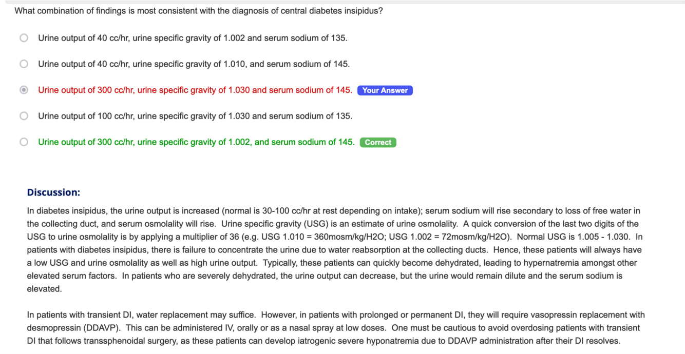 e. Urine output of 300 cc/hr, urine specific gravity of 1.002, and serum sodium of 145.