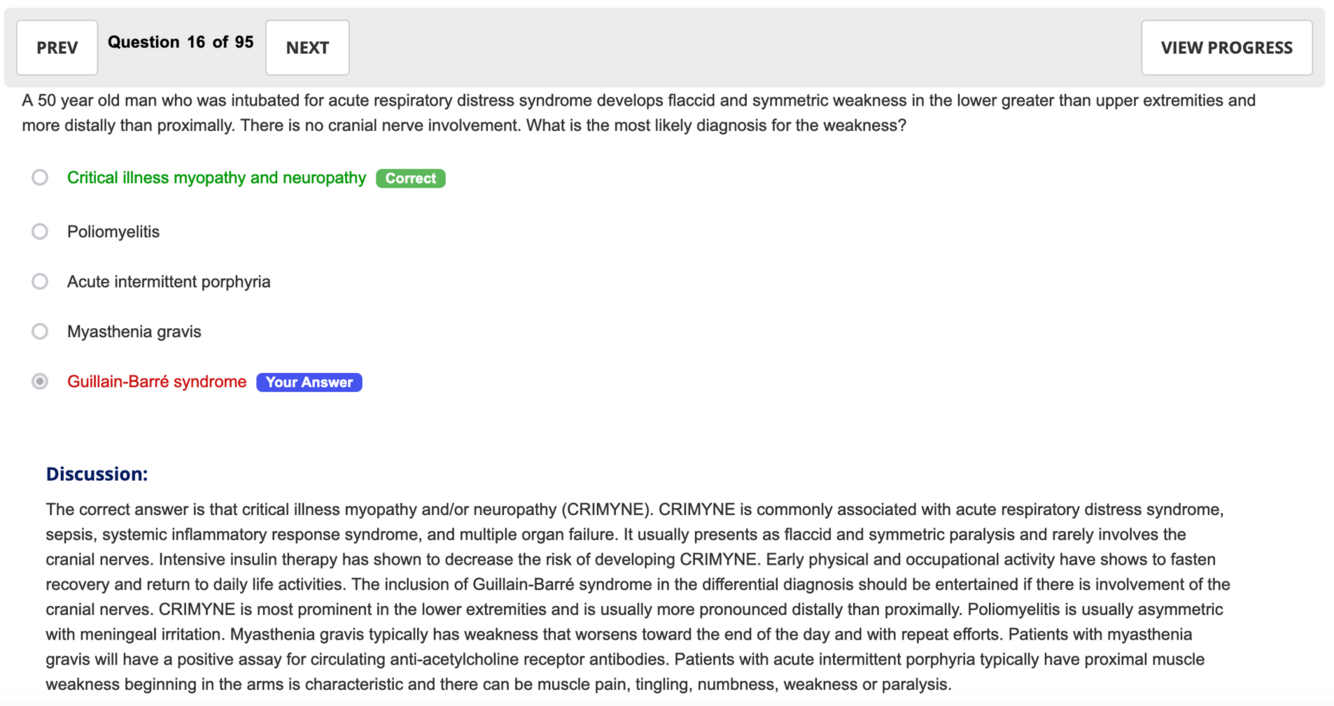 A 50 year old man who was intubated for acute respiratory distress syndrome develops flaccid and symmetric weakness in the lower greater than upper extremities and more distally than proximally. There is no cranial nerve involvement. What is the most likely diagnosis for the weakness?