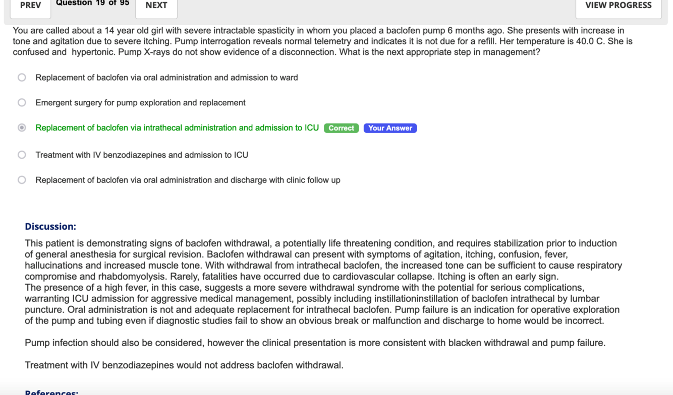 a. Replacement of baclofen via oral administration and admission to ward