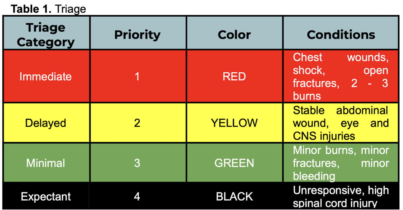 Rationale: Patients with conditions like chest wounds, shock, open fractures, and 2 - 3 degree burns are categorized as “Immediate” and are assigned the color RED (Priority 1).