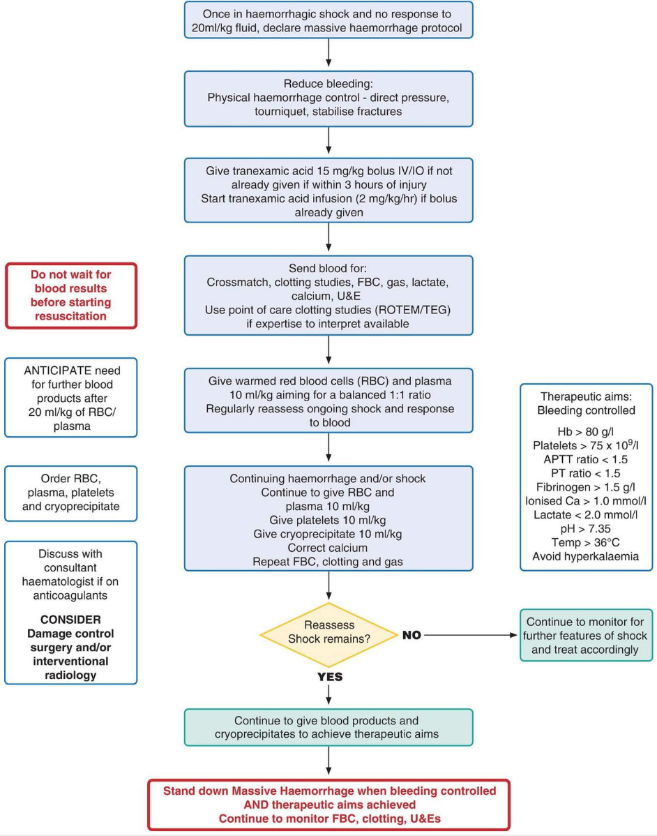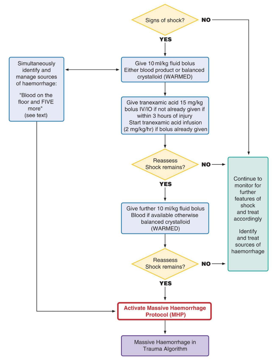 Management of shock in trauma APLS algorithm? Doses of fluid and drugs?