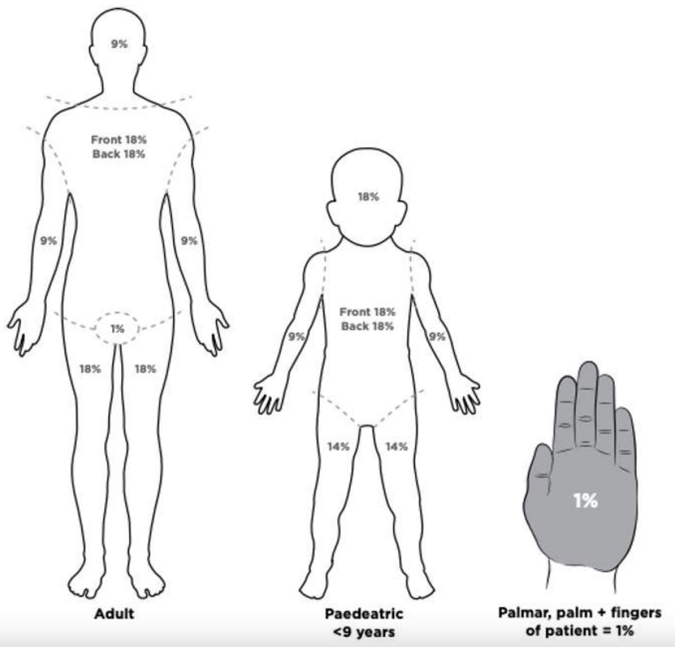 Parkland formula - Burn (in %) x Weight (in Kg) x 3 ml - (3mls per kg per % burn)