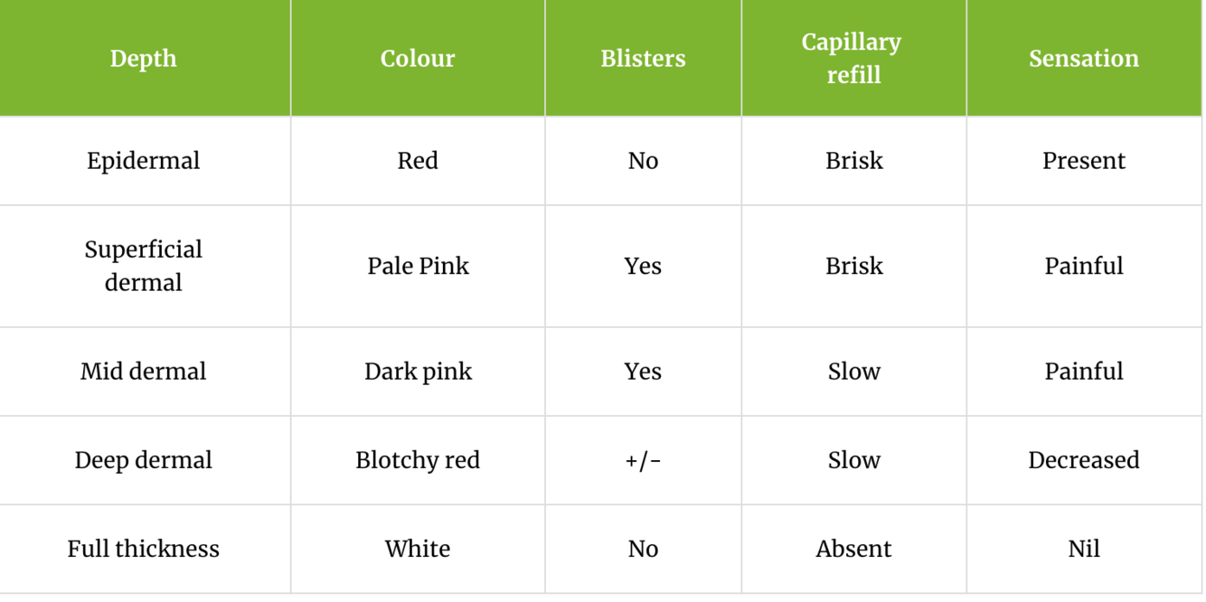 Epidermal vs superficial vs mid dermal vs deep dermal vs full thickness