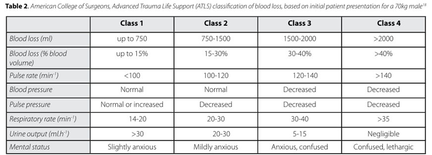 class 2= 15-30% (1.5L), postural hypotension, HR 100-120, pulse pressure dropped, RR 20-30. urine 20-30, anxious.