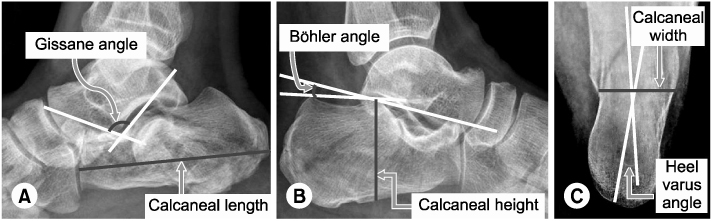 What are the typical radiographic measurements of a calcaneus fracture