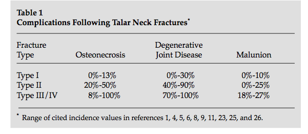 What are complications associated with talar neck fractures?