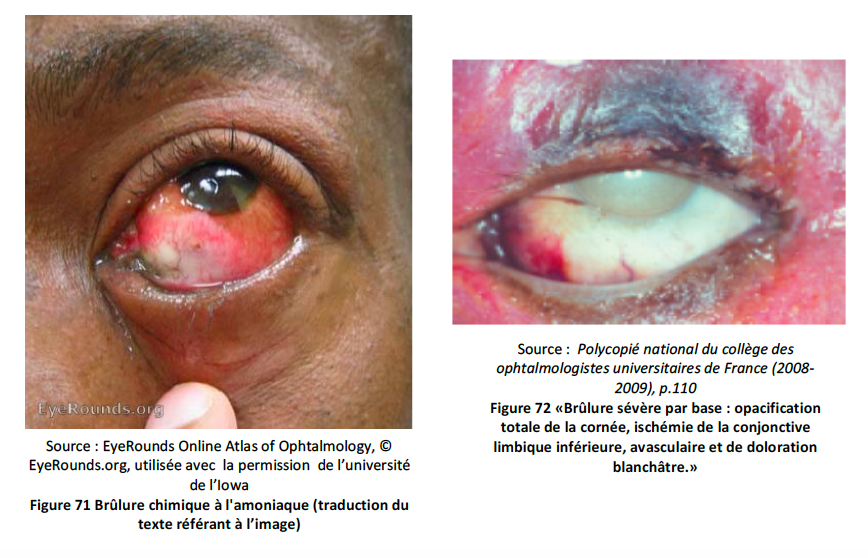 Les brûlures chimiques d’origine alcaline sont généralement plus dangereuses que les brûlures chimiques acides. Pourquoi? Parce que les brûlures chimiques acides coagulent les protéines du stroma cornéen en surface ce qui limite les dommages tandis que les brûlures alcalines pénètrent en profondeur, car elles détruisent les membranes cellulaires.
