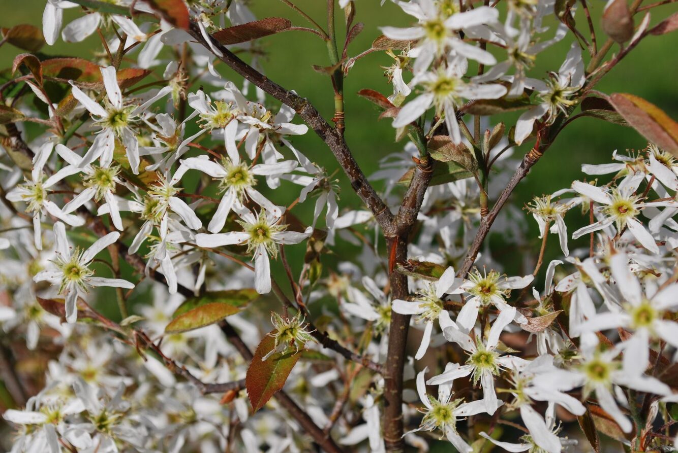 Amelanchier are small deciduous trees or shrubs with showy white flowers in early spring, red to purple fruits and often good autumn colour