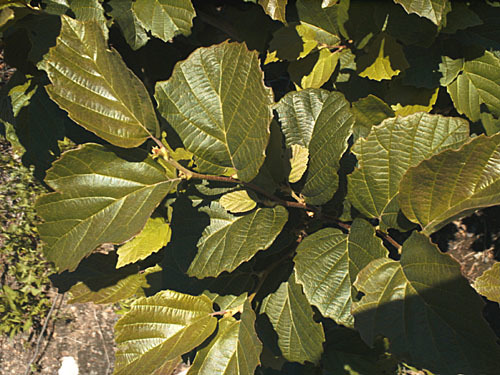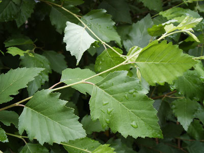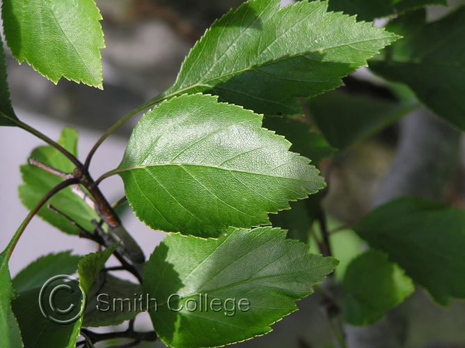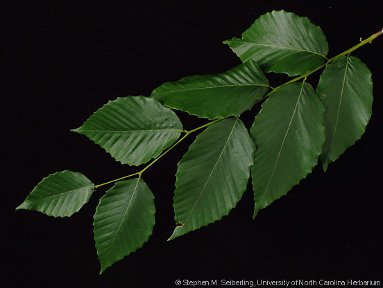 wedge shaped leaves, serrated on top half, 5-8 vein pairs,