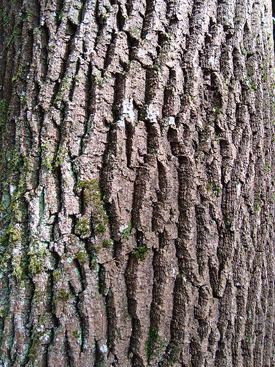 Ash bark is smooth grey or a pale grey-brown in young trees. In older trees the bark becomes fissured into interwoven ridges and can resemble the bark of Oak