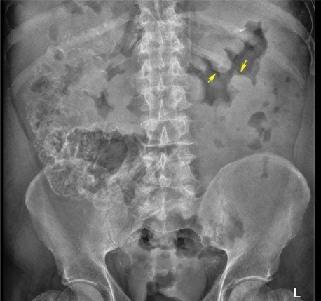 Ix: Abdo X-ray - separation of haustra, coffee bean sign (sigmoid volvulus)