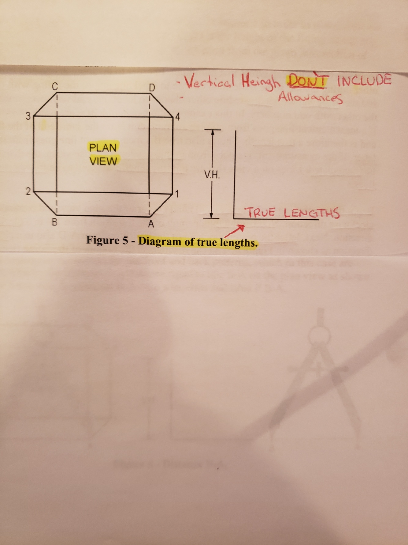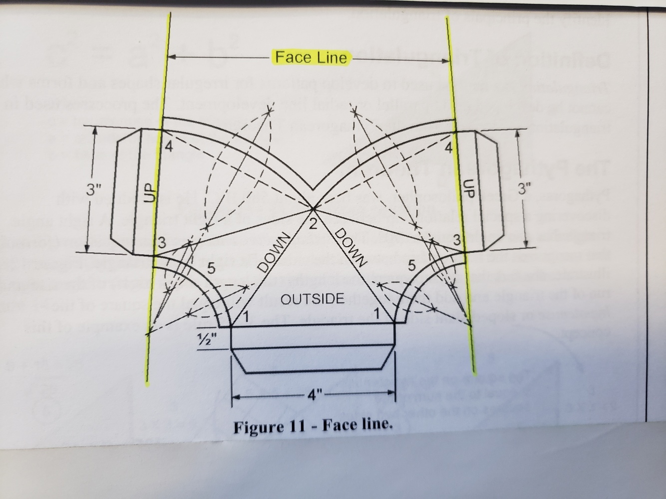 3. From Diagram of True Lengths transfer the distance V.H to A-1 to pattern center line starting at base line, moving up. This new point is actual hiegth of fitting.