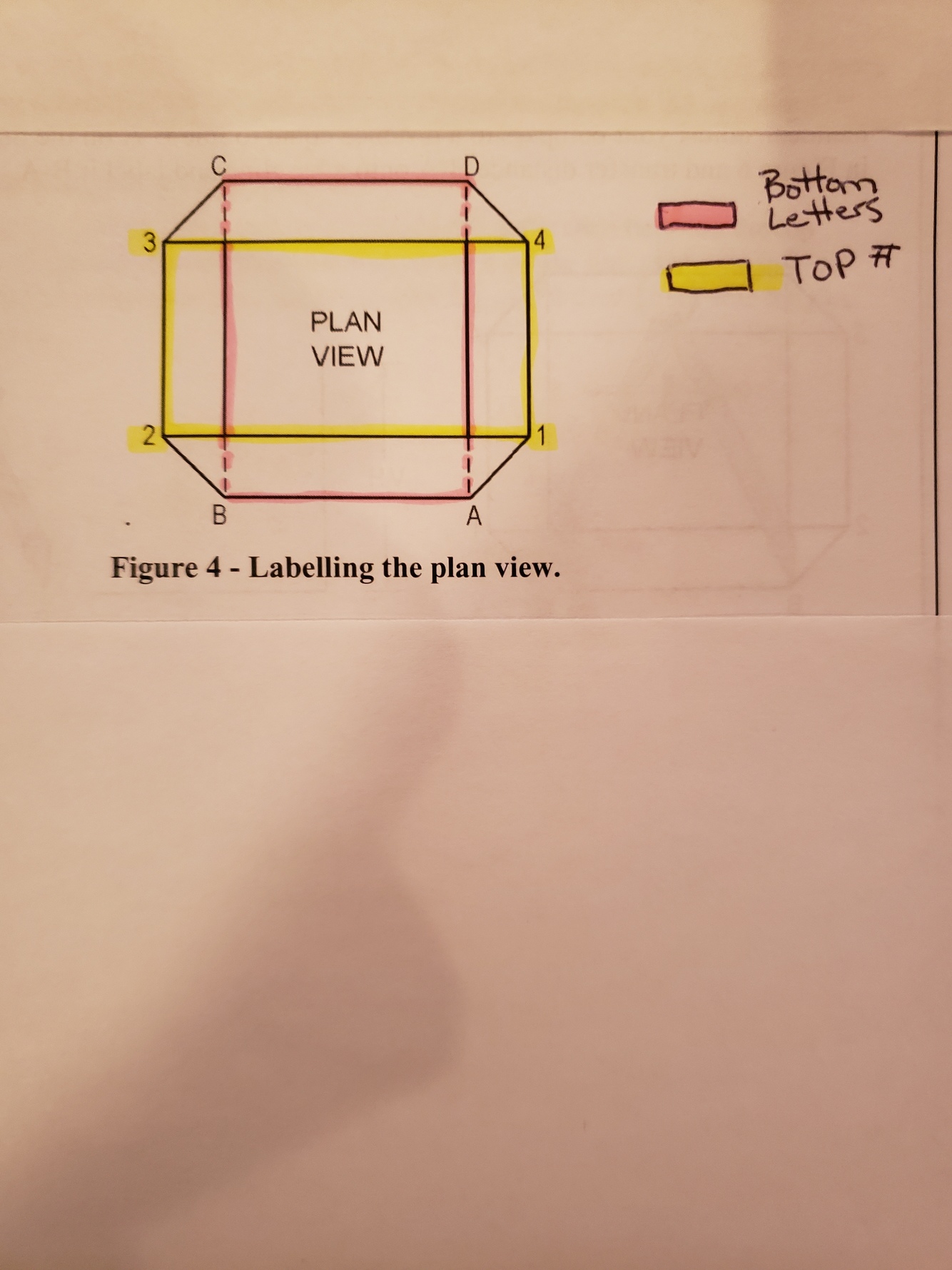 4. From Plan View, transfer the distance of point 1 to center line to patterns new top horizontal line, swinging from center line. This will give you points 2 and 1 on pattern.