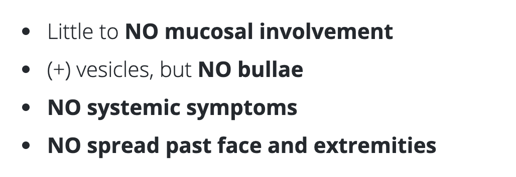 Tx: antihistamines, low dose topical CS, valcyclovir if viral