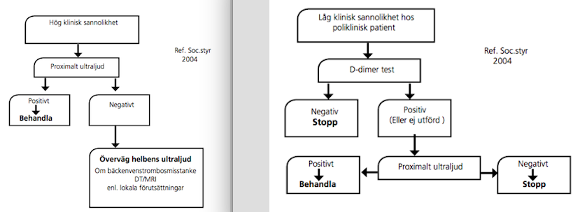 Där låg sannolikhet är under/lika med 1 poäng och hög sannolikhet är över/lika med 2 poäng. Där efter går man två vägar – antigen D-dimer test eller Proximalts ultaljud (även Datatomografi går att använda)