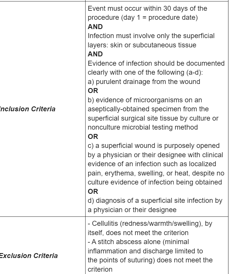 Inclusion and exclusion criteria for superficial surgical wound infections