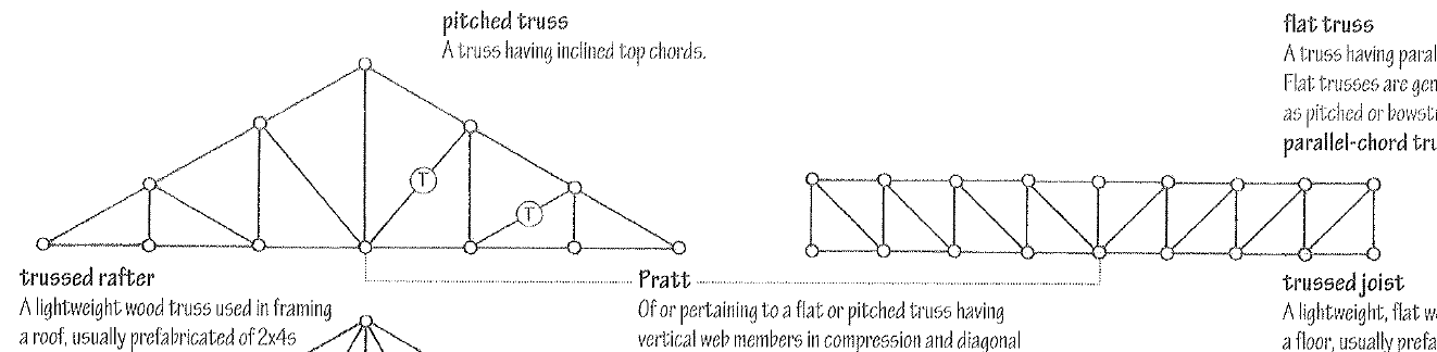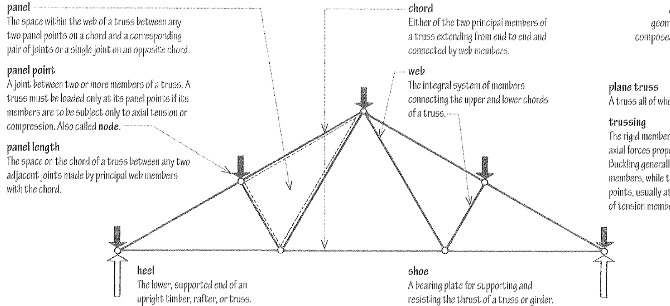 The rigid members forming a truss, subject to axial forces proportional to the rise of the truss. Buckling generally governs the size of compression members, while tensile stresses at the weakest points, usually at the connections, control the size of tension members.