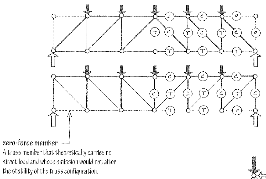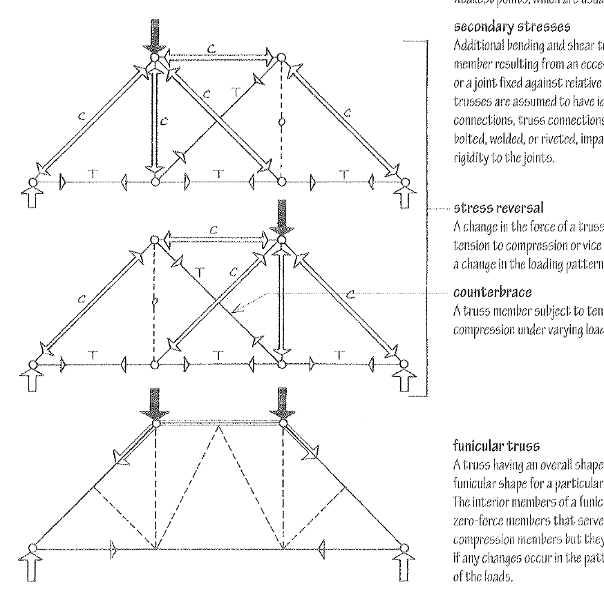 A truss having an overall shape derived from the funicular shape for a particular set of loads. The interior members of a funicular truss are zero-force members that serve only to brace compression members but they will carry forces if any changes occur in the pattern or magnitude of the loads.