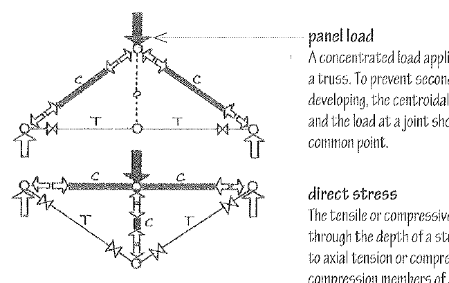 A concentrated load applied to a panel point of a truss. To prevent secondary stresses from developing, the centroidal axes of truss members and the load at a joint should pass through a common point.