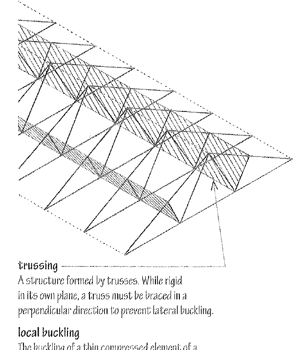 A structure formed by trusses. While rigid in its own plane, a truss must be braced in a perpendicular direction to prevent lateral buckling.