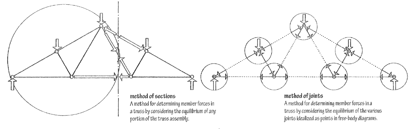 A method for determining member forces in a truss by considering the equilibrium of any portion of the truss assembly.