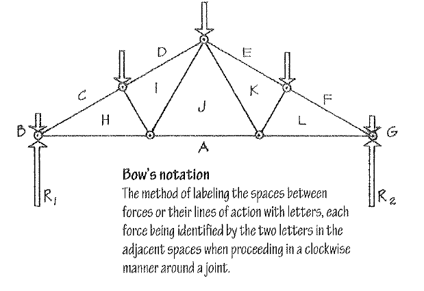 The method of labeling the spaces between forces or their lines of action with letters, each force being identified by two letters in the adjacent spaces when proceeding in a clockwise manner around a joint.