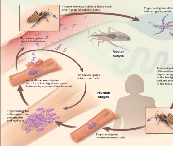 After a stage of initial parasitemia, trypomastigotes pass to the cardiac muscle and smooth muscle lining the intestinal tract. Here they transform into the amastigote