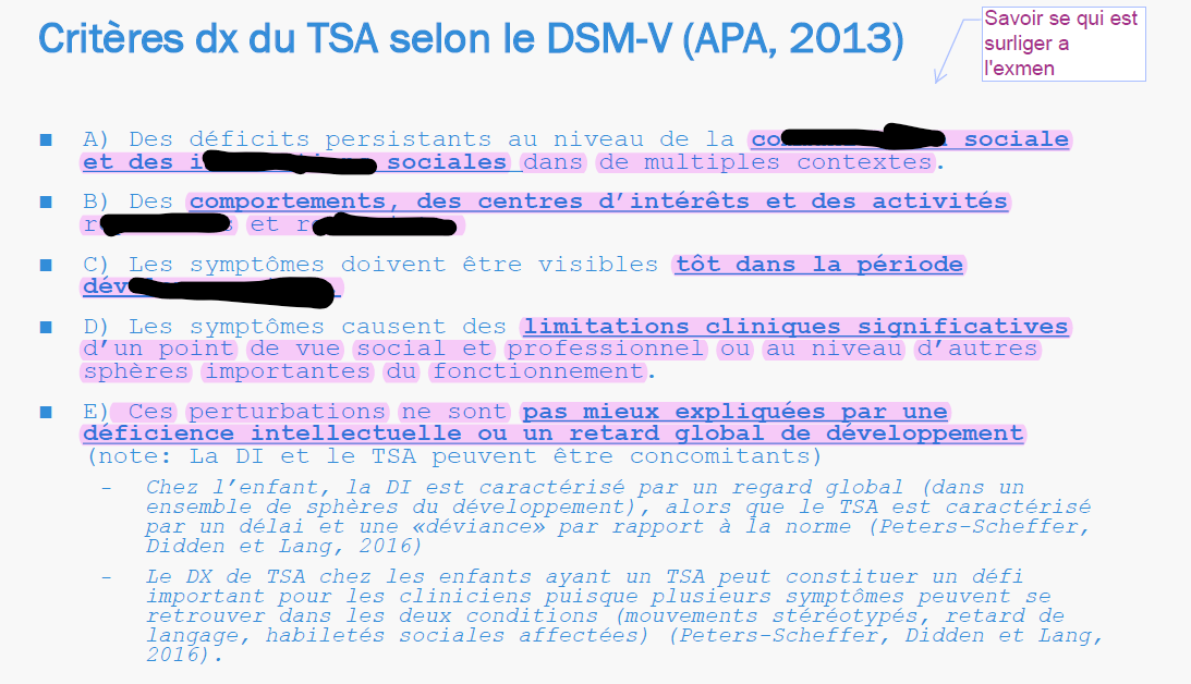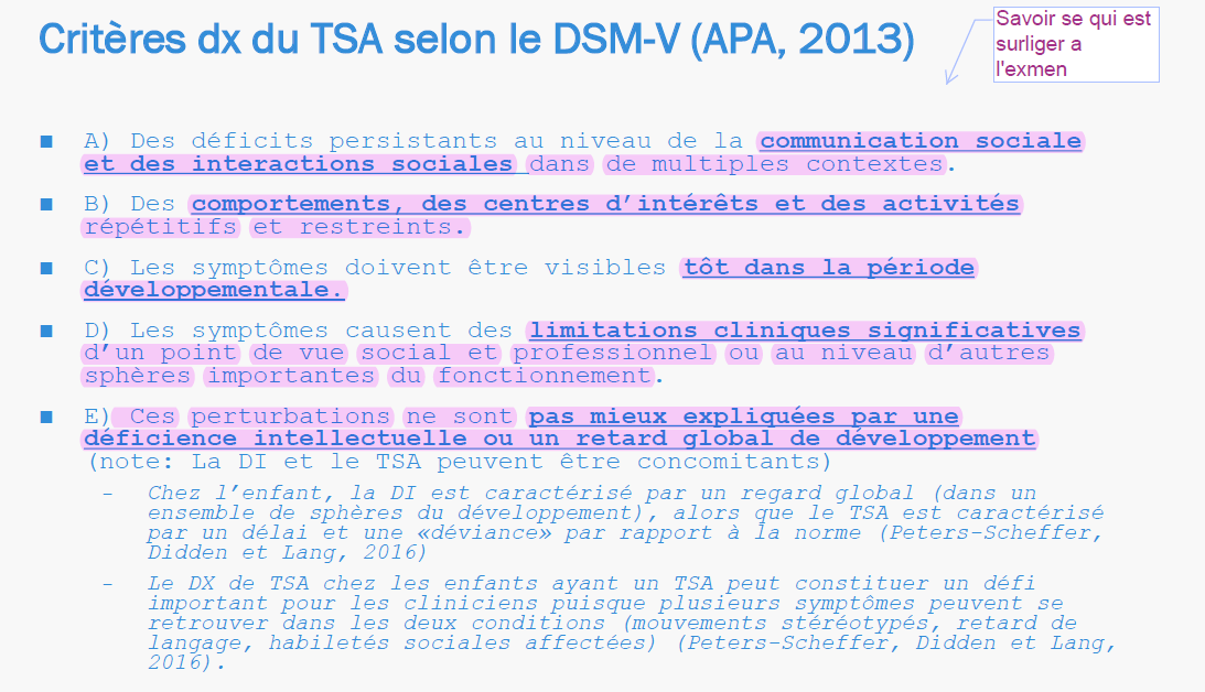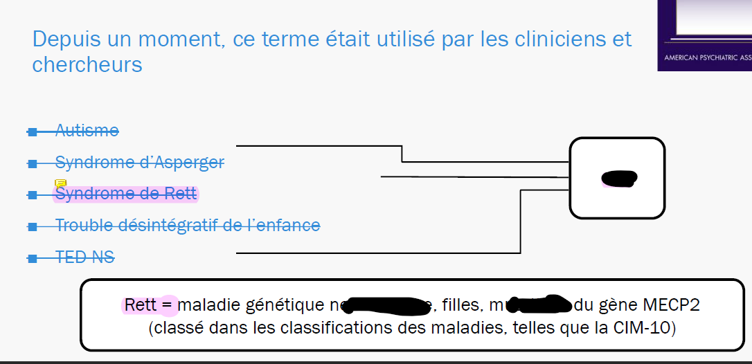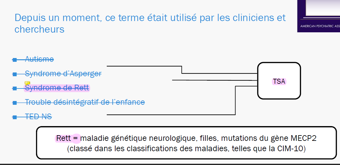 Avec le DSM V (APA 2013) :Troubles du spectre de l’autisme ( TSA ) :