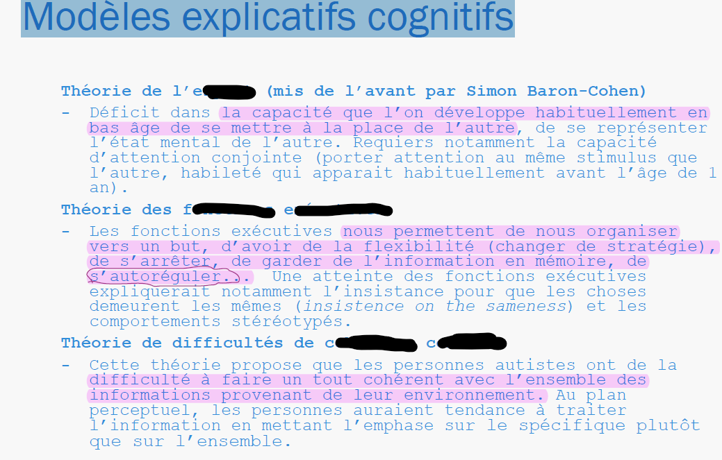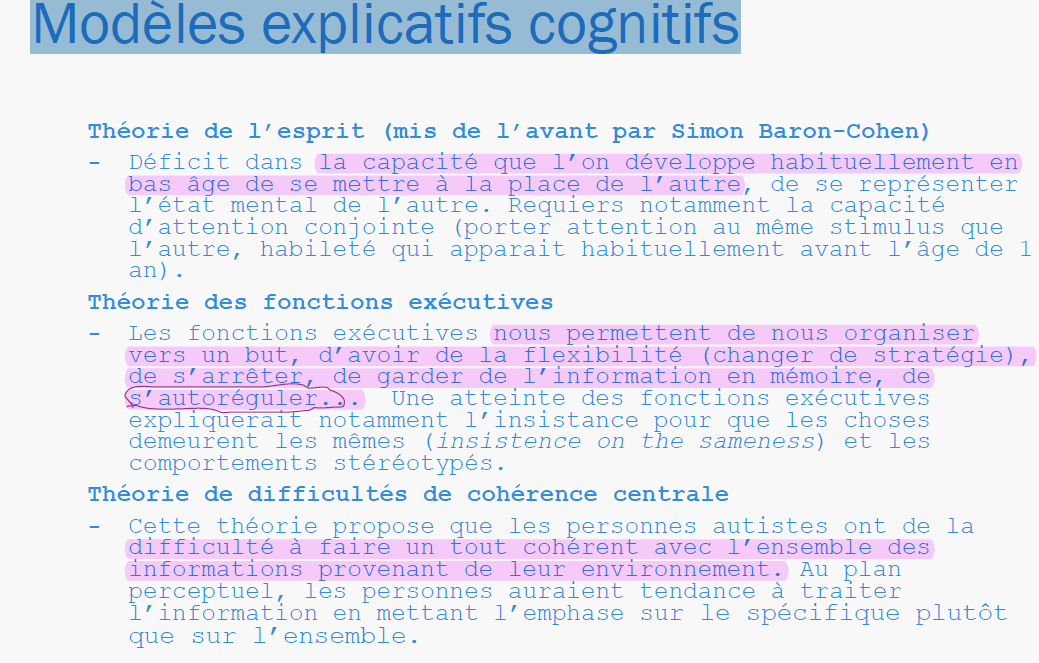 Modèles explicatifs comportementaux ■ Modèles explicatifs comportementaux – Chez les personnes autistes, les comportements répondent aux lois de l’apprentissage comme chez l’ensemble de la population. L’autisme est causé par une mauvaise adéquation entre l’enfant (son système nerveux) et son environnement. L’intervention vise donc une ma\_\_\_\_\_\_\_\_\_\_ de l’en\_\_\_\_\_\_\_\_\_\_\_ plutôt que l’identification et le traitement du système nerveux. Certains proposent notamment que les enfants ayant un TSA ont besoin de beaucoup plus de constance, d’autres ont avancé l’idée que les stimuli sociaux étaient insuffisants pour renforcer les comportements ce qui expliquerait les déficits des comportements émotionnels et sociaux. D’autres auteurs avancent que certains comportements répétitifs servent à échapper à des stimuli sensoriels.