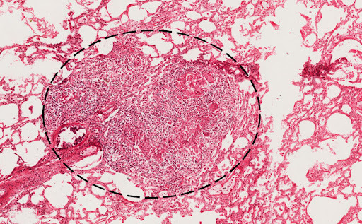 Como se denomina o foco pulmonar onde se inicia o processo de formação do granuloma?