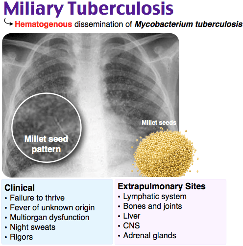 Chest x-ray shows multiple nodules which look like millet seeds (hence miliary)