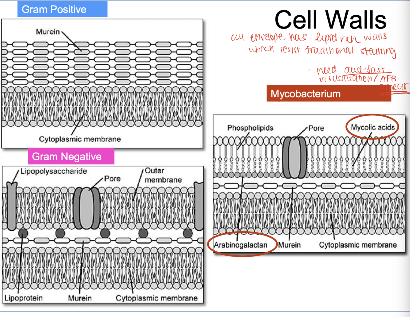 arabinogalatan and mycolic acid. prevents them from catching staining. need acid fast visualizeation.
