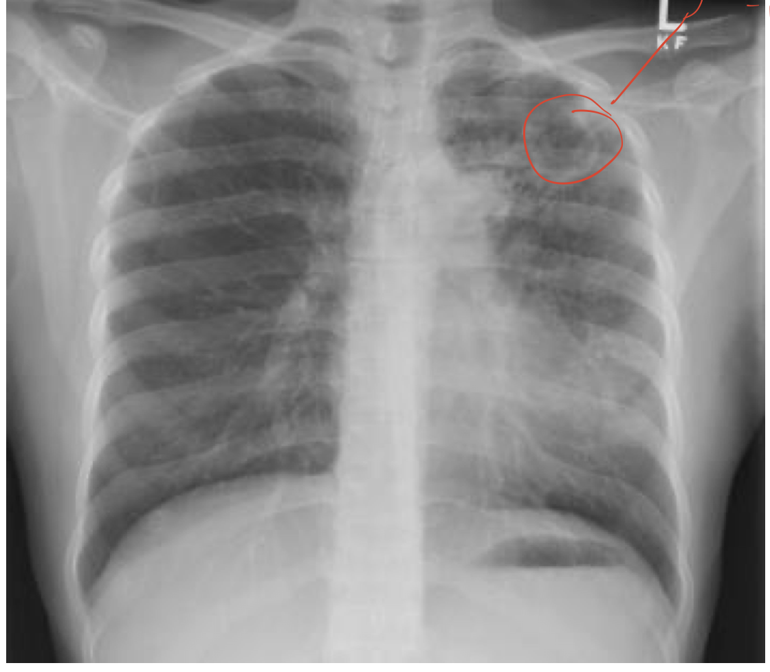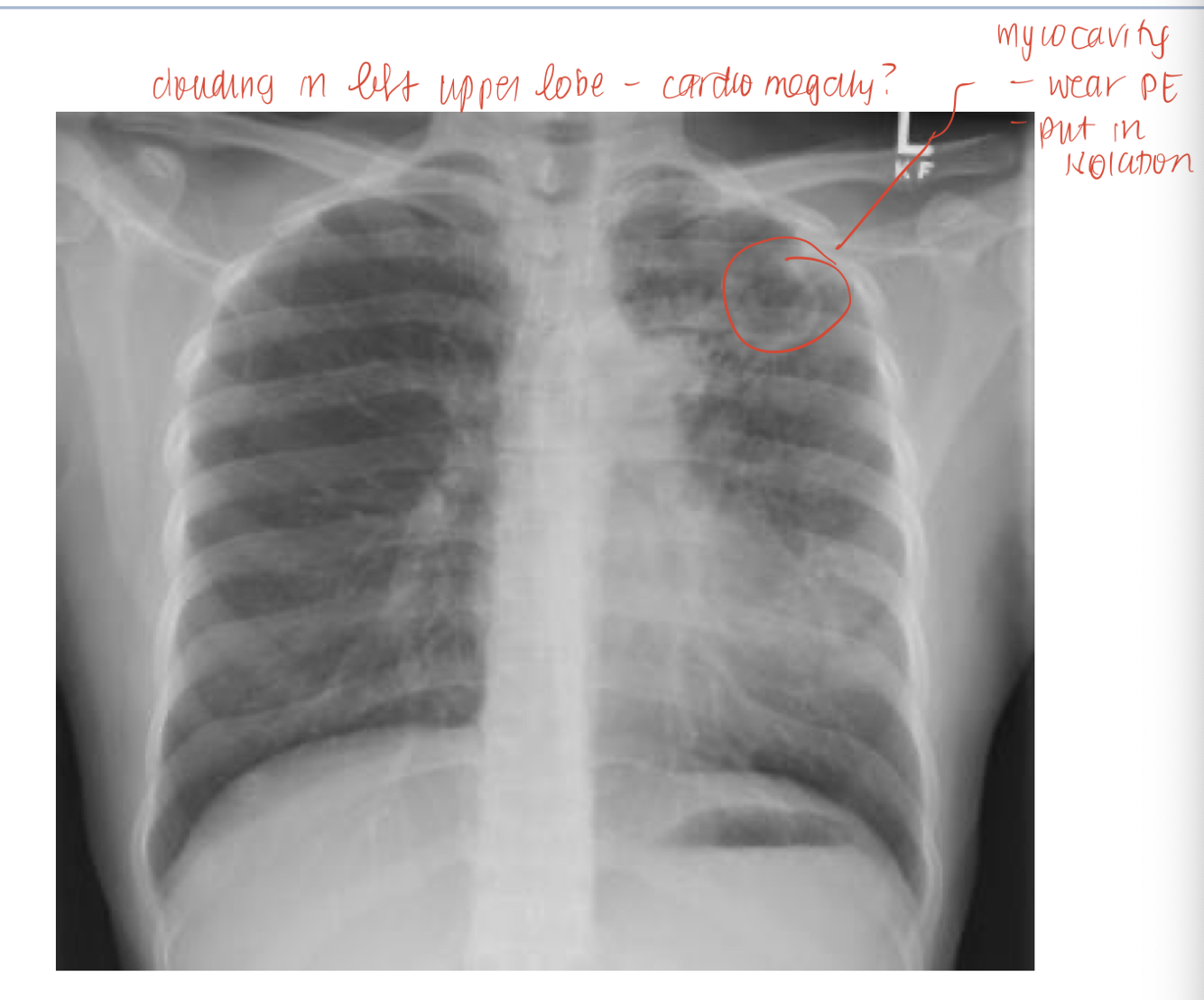 cough, hemotysis, fever, dyspnea, weight loss, night sweats, subacute or chronic presentation. need to do CXR