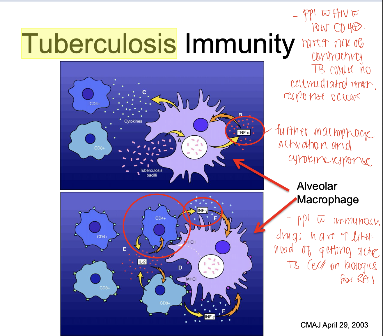 normally, macrophages ingest the TB and signals CD4 cells to become activated and causing further macrophage activation and cytokine response . in HIV, there are low CD4 levels. have increase risk of reduced immune response.