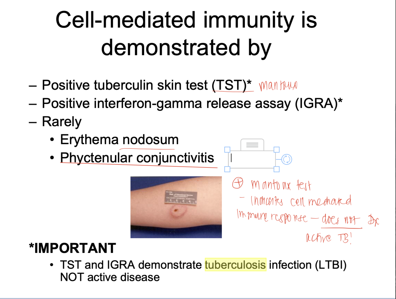 by positive TST/mantoux test or positive IGRA test. NOTE: TST and IGRA do not demonstrate active disease!! just latent.