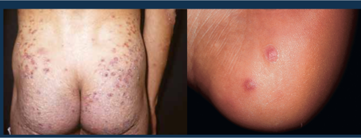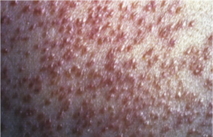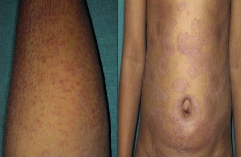 Niños con TB ganglionar o esquelética, BCG. Pápulas planas, rosa, firme, perifolicular, descamación, en tronco. Meses y desaparecen