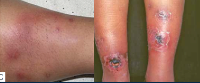 mujeres 85%, adolescencia ó menopausia. Pantorrillas, nódulos SC que involucionan ó se rompen: úlceras profundas irregulares de bordes azulados: cicatrices hiperpigmentadas atróficas