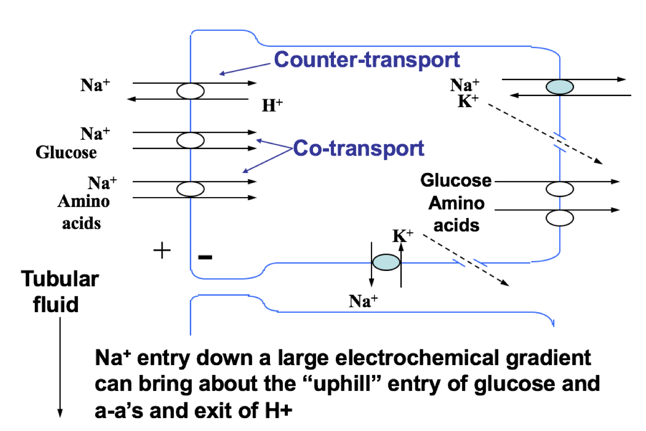 Transporters are located in different parts of the nephron. Most of the Na transporters are located in the proximal tubule, while fewer are spread out through other segments.